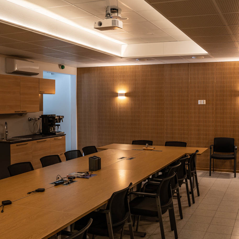 Olemme tehneet vaativia konttori, ym. tilojen toteutuksia. Kuvassa Ranuan kunnan kokoustila.